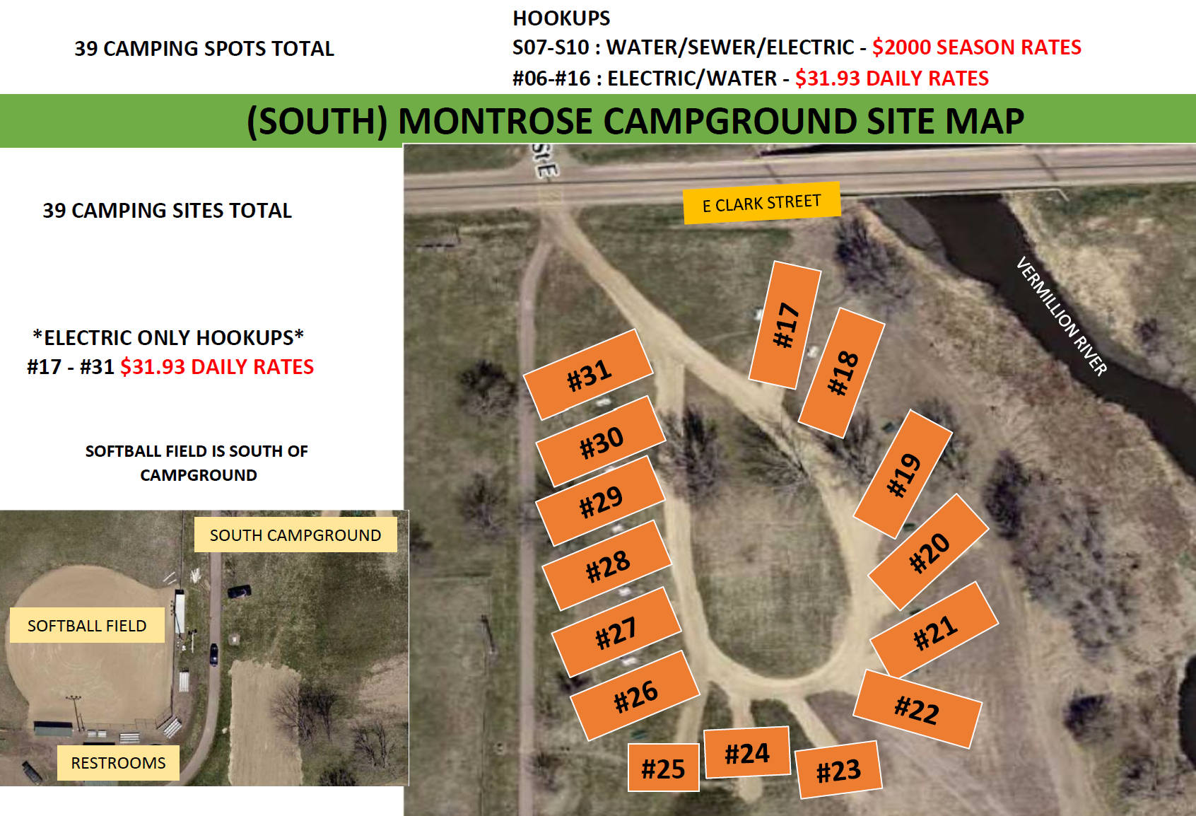 Five pull-through. The remaining are back-in. Some sites are 30 amp, others are 50 amp. There is a bath house with handicap accessibility. A dump station is available on the north side of the bath house. There is a walking path that circles the pool area and follows along the Vermillion River. The newest addition will also take you to the softball park area.